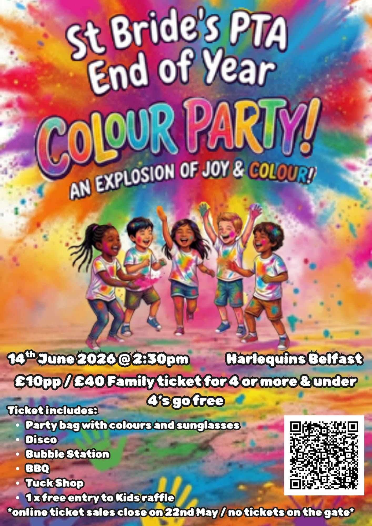 Tickets are available now via https://hub.klubfunder.com/StBridesPTA/payit/eventregistration/st-bride-s-pta-end-of-year-colour-party-/detail